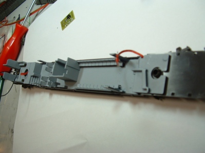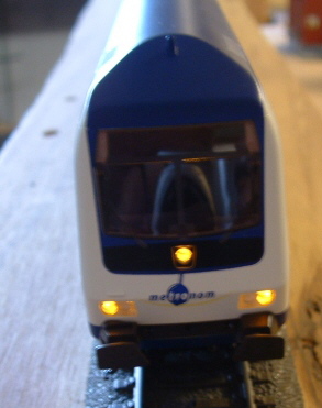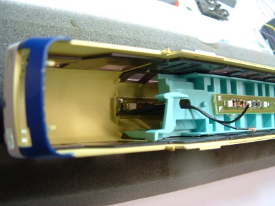 abgetönten Scheiben genügend Licht zu sehen sein wird. Nun wird dem Steuerwagen erst noch eine stromführender NEM-Schacht für die RTS-Kupplungen verpasst. (beschrieben unter anderem hier ). Fahrtests mit diesen Kupplungen zeigen, dass der Zug auch allerbestens geschoben fahren kann ohne dass Entgleisungen zu befürchten sind. |