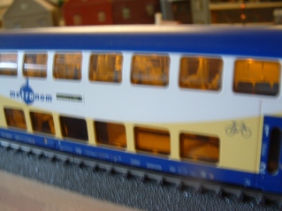 Spätestens beim Versuch, den Zug zu beleuchten, merkt man aber, dass Märklin bei diesem Zug gespart hat: Die Einrichtung des oberen Stockes in den Waggons fehlt völlig und man hat, um das zu verbergen, die Einrichtung unten in mattem Schwarz ausgeführt und die Scheiben der Waggons abgetönt. Bringt man Licht in die Fahrzeuge, so “versackt” es in der schwarzen Umgebung. |