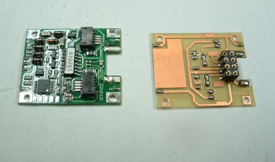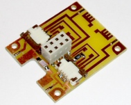 Wenn Sie eine solche Lok ebenso auf einen anderen Decoder umrüsten möchten, dann empfehle ich die rechts gezeigte Platine 8011 von Lüssi. Auf der Platine befinden sich auch die Steckanschlüsse für die Flexleiter zu den LEDs und auch die benötigten Vorwiderstände sind bereits vorhanden. Der Rainer liefert sehr prompt und in sehr guter Qualität. Sehr viele gute Informationen sind auf seiner Website zu finden. Dort findet man auch eine Liste der Loks, in der die Platine einsetzbar ist. (in der V80 von Märklin sollten die Kabel direkt verlötet werden, weil in der Höhe der Platz für den Stecker fehlt) |